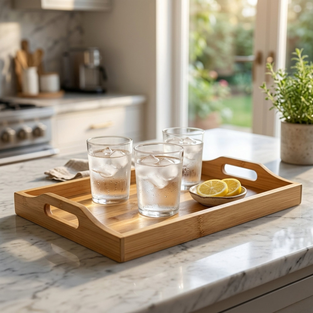 • Shape: Ergonomically designed rectangular surface with raised edges to prevent slipping. Smooth side handles ensure a firm and comfortable grip while carrying beverages or food.
