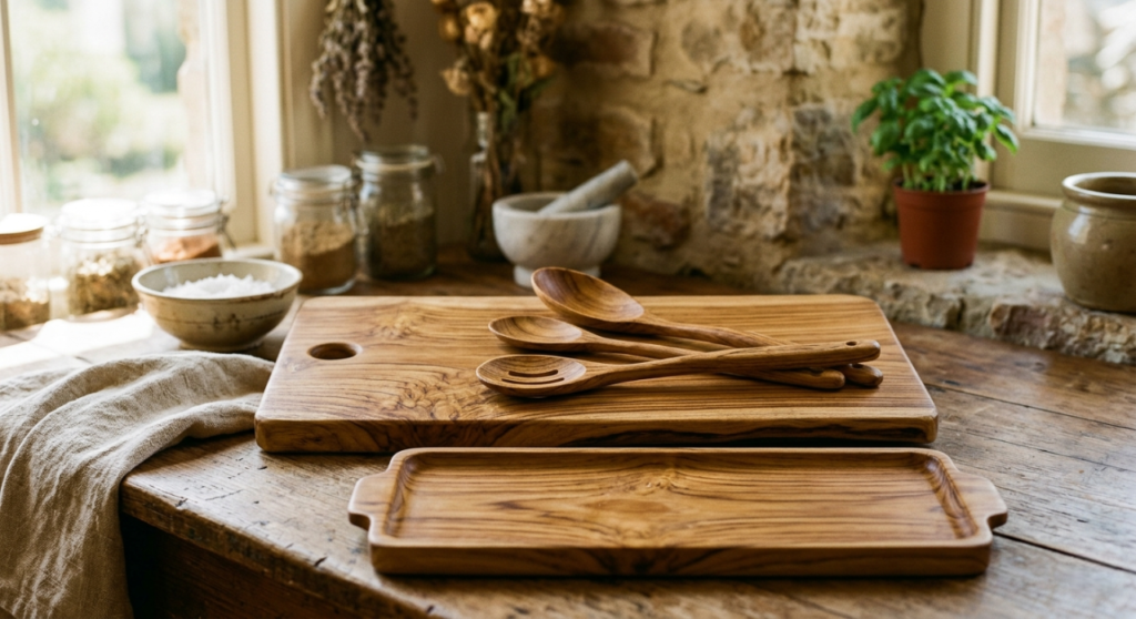 Teak Wood – The King of Durability is widely regarded as one of the finest materials for handcrafted kitchenware. Its natural oil content makes it exceptionally resistant to water, moisture, and even pests. This is why teak has been used for centuries in shipbuilding and outdoor furniture—and it performs just as brilliantly in the kitchen.